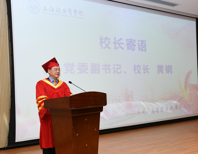 黄钢校长以“我们都是健康追梦人”为题为同学们送上毕业寄语和深情祝福。他代表学校向毕业生们表示热烈祝贺,高度赞扬同学们不屈不挠、八面威风地面对学习、生活、工作的压力,克服种种难关,用汗水浇灌收获,用实干笃定前行。黄校长嘱托大家要始终牢记自己的初心和使命,初心是源于追逐梦想的决心,是源于勤勉实干的匠心,是源于终身学习的恒心,希望同学们要坚定逐梦健康的信仰,成为名副其实的具有健全人格和心理、能够解决实际问题、具有行业引领潜质的人类健康促进者。黄校长最后勉励同学们:“未来已来,健康时代充满了新的机遇与挑战,努力是最好的锦鲤。‘厚德至善,健行康民’,我们都是健康追梦人;守初心,担使命,奔跑途中将一路点亮‘健康中国’的点点星光。星星之火可以燎原,相信在我们的共同努力下,我们将燎原中国的健康之梦,让健康中国更为充实,让健康之路更为宽广!”