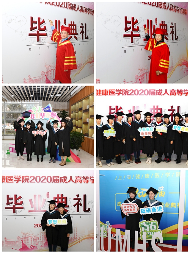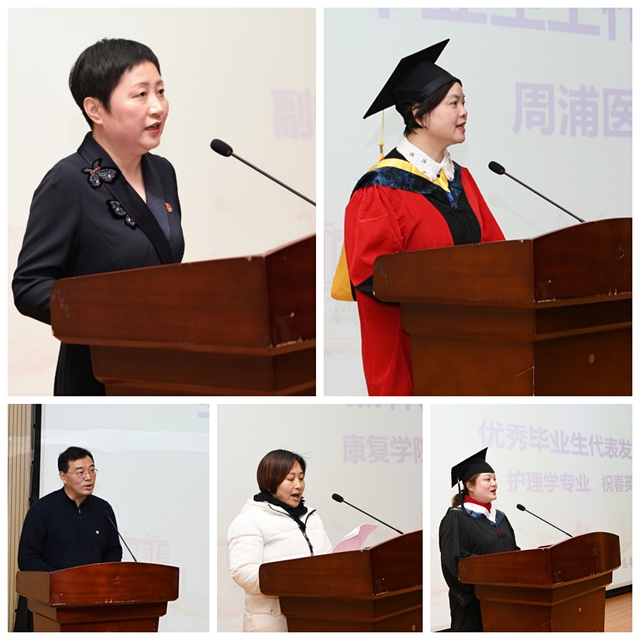 随后,祝春英同学代表全体毕业生发言。她表示在上健医的学习生涯即将画上句号,感谢母校给予平台实现梦想,感谢老师们的谆谆教导,感谢一路相伴的亲人朋友和同学。今后将谨记“厚德至善、健行康民”的校训,用自己的青春和汗水让“上海健康医学院”的名片更加响亮。来自康复学院的教师代表曹艳杰回忆了与同学们一起度过的美好时光,她勉励同学们以崭新的精神面貌,带着母校的嘱托,担当起健康使者的使命。教学点代表、杨浦区卫生健康教学基地主任吴浩回顾了十多年来与我校紧密合作,携手共同培养护理和康复治疗技术专业应用型人才的办学历程,为同学们克服困难完成学业而深感骄傲,祝福同学们在工作岗位上继续发扬积极进取、认真刻苦的钻研精神,收获更多成绩。毕业生工作单位代表、周浦医院护理部主任汤培凤祝贺同学们学成出关,通过高等学历继续教育的学习,同学们的理论知识更扎实、实践技能更娴熟,临床岗位胜任能力得到了提高,成长为单位业务骨干,希望他们将来在临床岗位上发挥更大的作用。