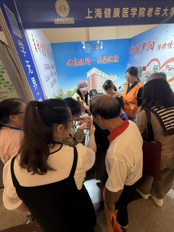 作为医教融合的高校老年大学参展代表之一,上海健康医学院老年大学以“健康+”理念为引领,全面展示我校在老年学习与健康教育领域的特色亮点和创新实践。本次参展由学校继续教育学院统筹组织,教师与志愿者(“健康小橘子”)共同组成参展团队,以专业的讲解与温暖的服务,充分展现健康老年大学在健康促进与社会服务中的责任与担当。