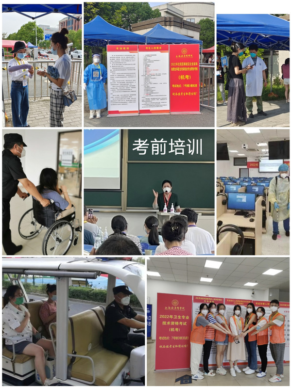 考试当天,后勤中心一早便将几台强力风扇放在了入校安检口,在此炎炎夏日为匆匆赶来的考生送来清凉,让他们保持良好的考试心态;志愿者们细心指引,一路引导,不耽误考生一分钟时间;如遇孕妇、伤员、考试允许范围内迟到的考生,保卫处会专门安排短驳车送至考场门口;遇到不符合入场条件的考生,考务工作人员也会耐心安抚,尽可能帮助他们解决问题;考场内时刻准备着一次性手套、N95口罩、免洗手消毒液、风油精、酒精棉片、消毒湿巾等物资,供考生取用;每场考试结束,专业人员准时对考场内进行全面、有效地消杀,以保障考场环境安全卫生。考试期间,上海市卫生人才交流服务中心老师莅临学校督查考试,并对我校考务工作予以肯定。